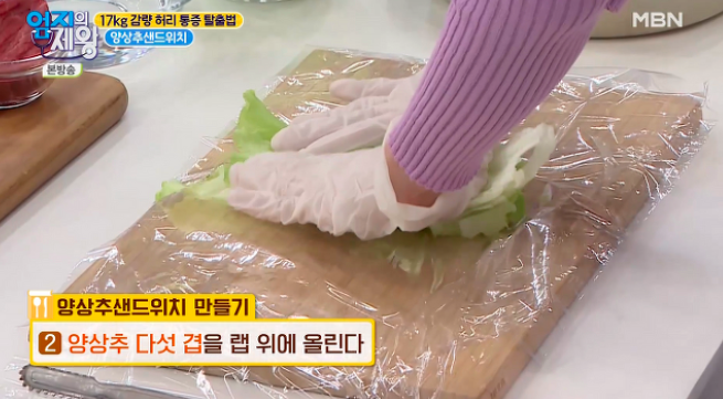 그 위에 양상추 다섯 겹을 다시 덮어 눌러 준 다음